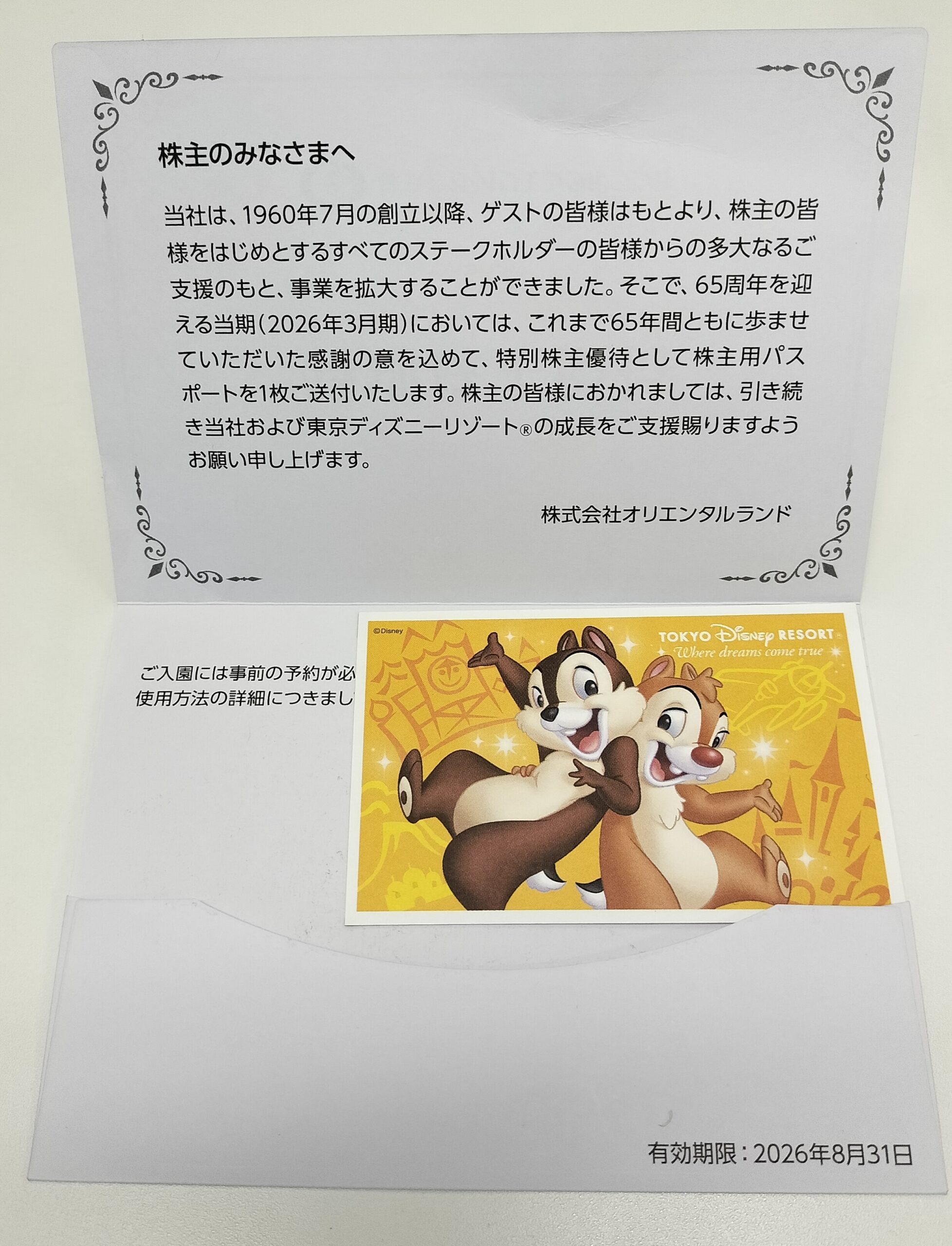 OLCの9月末締めの株主優待は、通常3年以上の保有期間がないともらえないのですが、2025年9月末は、オリエンタルランド65周年記念ということで、特別に100株以上保有する全ての株主に優待パスポートが配られました。